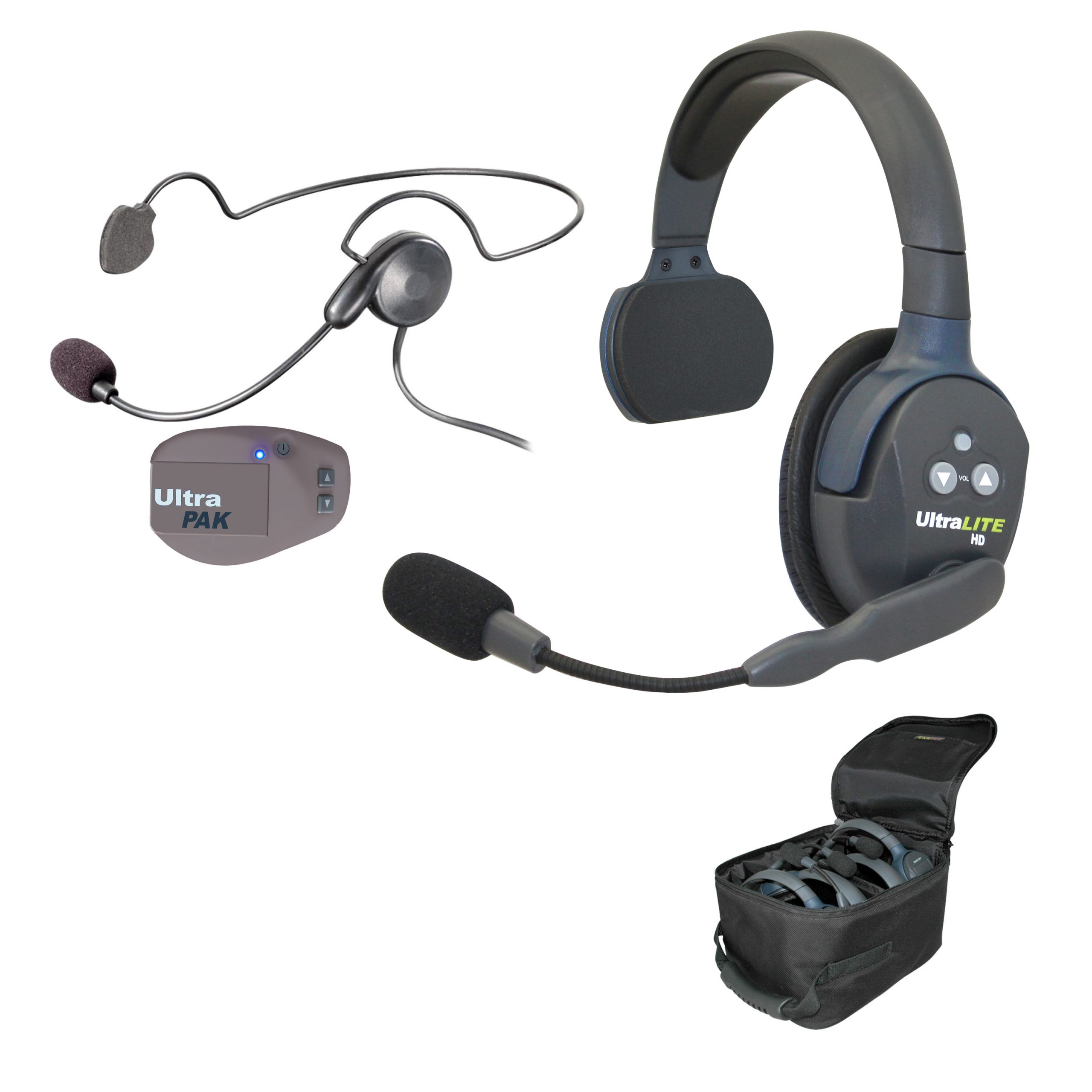 The Eartec UltraLITE™ w/UltraPAK™ is a professional full duplex intercom for people that need to communicate and work with their hands. This compact system features one UltraLITE dual ear wireless headset, a “Main” that sets the digital sequence, and one “Remote” UltraPAK with lightweight Cyber headset. UltraLITE™ utilize Digital Enhanced Cordless Technology (DECT) to provide professional, simultaneous talk wireless communication within a quarter mile range. The UltraLITE™ series are a breakthrough because all electronics, including the battery are built right inside the headset earcups, eliminating wires and belt worn radios. The system does not require a base station, and the headsets are field programmable, meaning that the system can be expanded at any time.