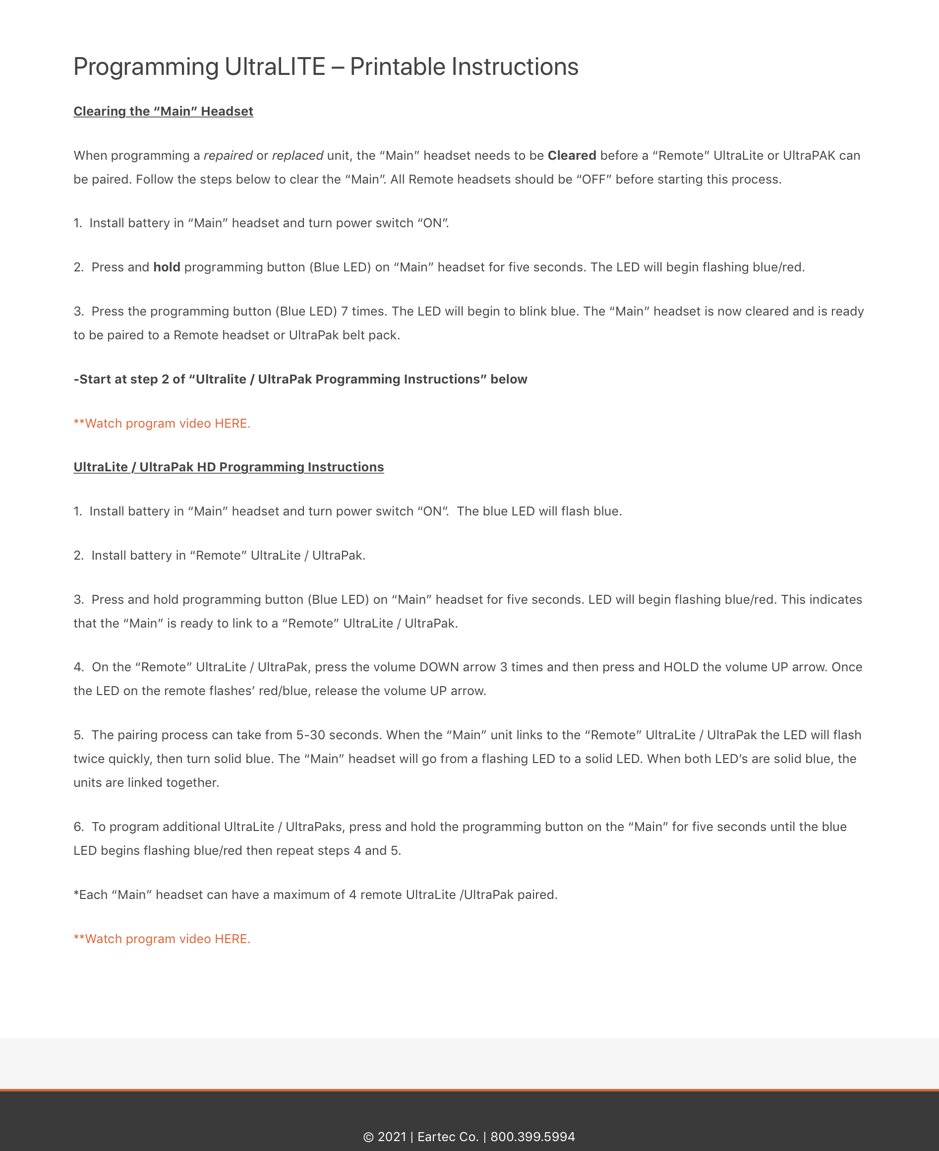 When programming a repaired or replaced unit, the “Main” headset needs to be Cleared before a “Remote” UltraLite or UltraPAK can be paired. Follow the steps below to clear the “Main”. All Remote headsets should be “OFF” before starting this process.