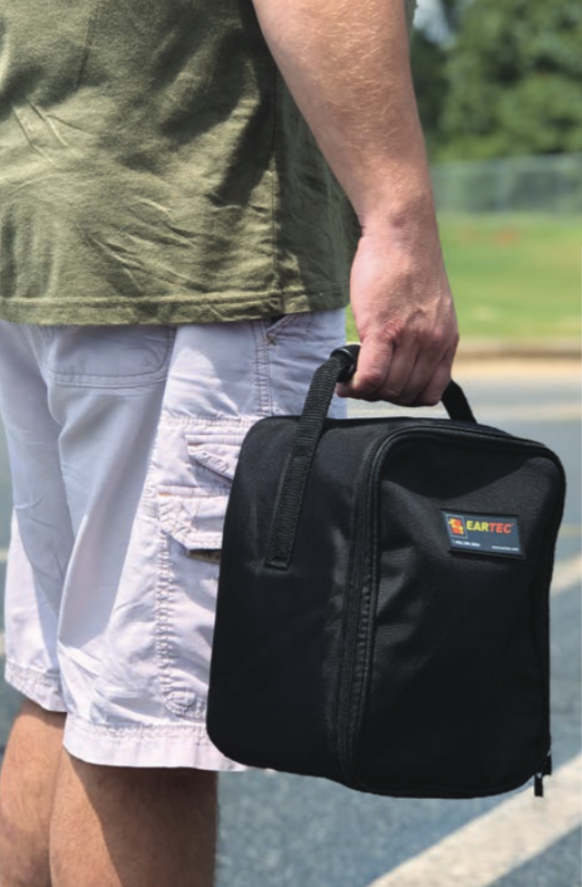 The volume is adjustable through two buttons on one of the ear cups, and five volume settings are available. Push the button and an audible tone lets you know how loud the volume actually is. A boom is mounted just below the buttons; when it's up, the mic is off, and lowering it turns it on. It can swivel 270 degrees so the headset can be used on the left or right ear. The ear cups and boom are adjustable, so you can get the fit and feel just right. Power for the headsets comes from a very small rechargeable lithium battery, and a charger for that battery is included. Eartec sends the headsets in a reusable pouch that protects all the components and makes it easy to transport everything to and from the track.