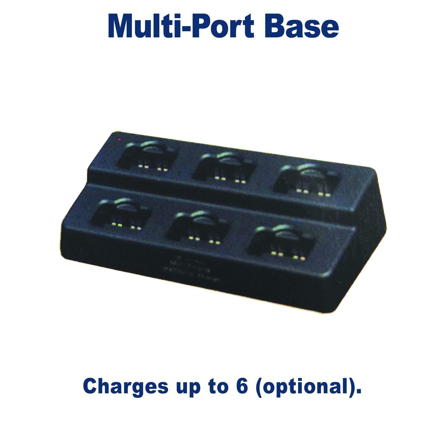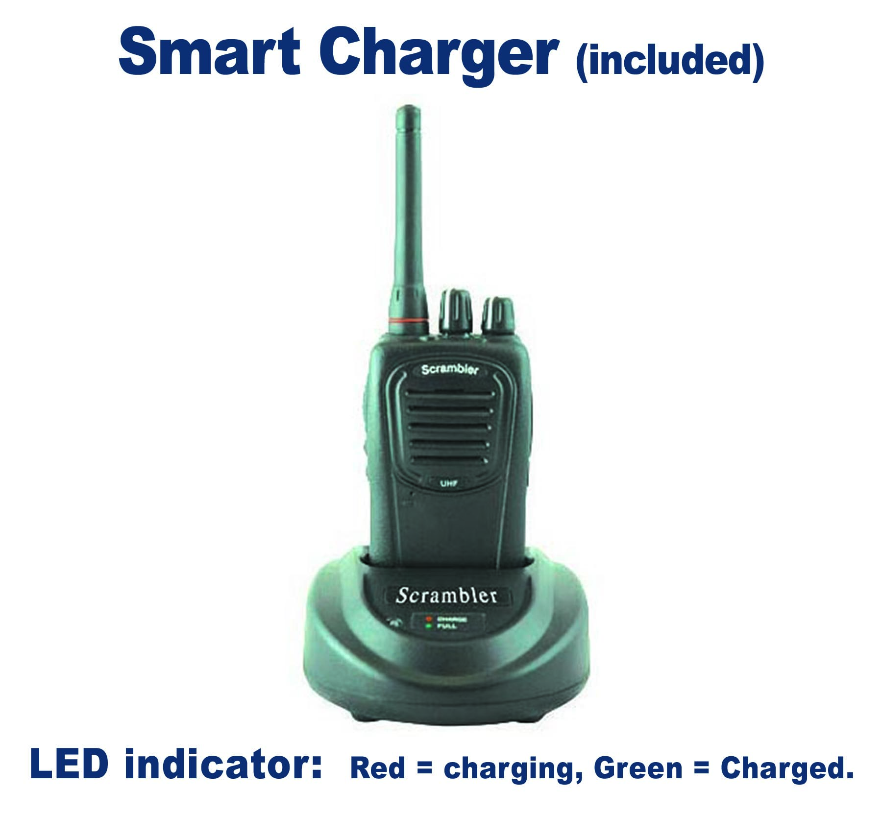 Scrambler Plus include powerful Lithium Polymer batteries. These high capacity rechargeables will not develop a memory so they do not have to be drained after use. To charge the batteries place the radios into the desktop charging base (included). A Red LED indicates the battery is charging, Green LED shows that the battery is ready to go. Battery life on a full charge is approximately 8 hours.