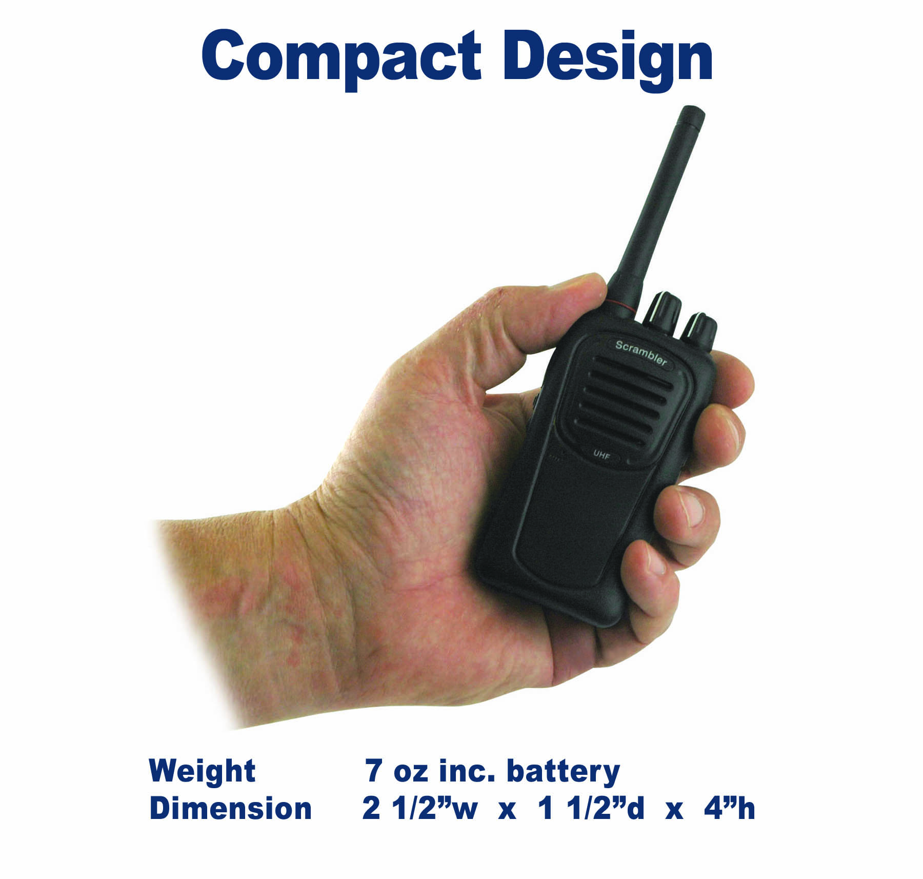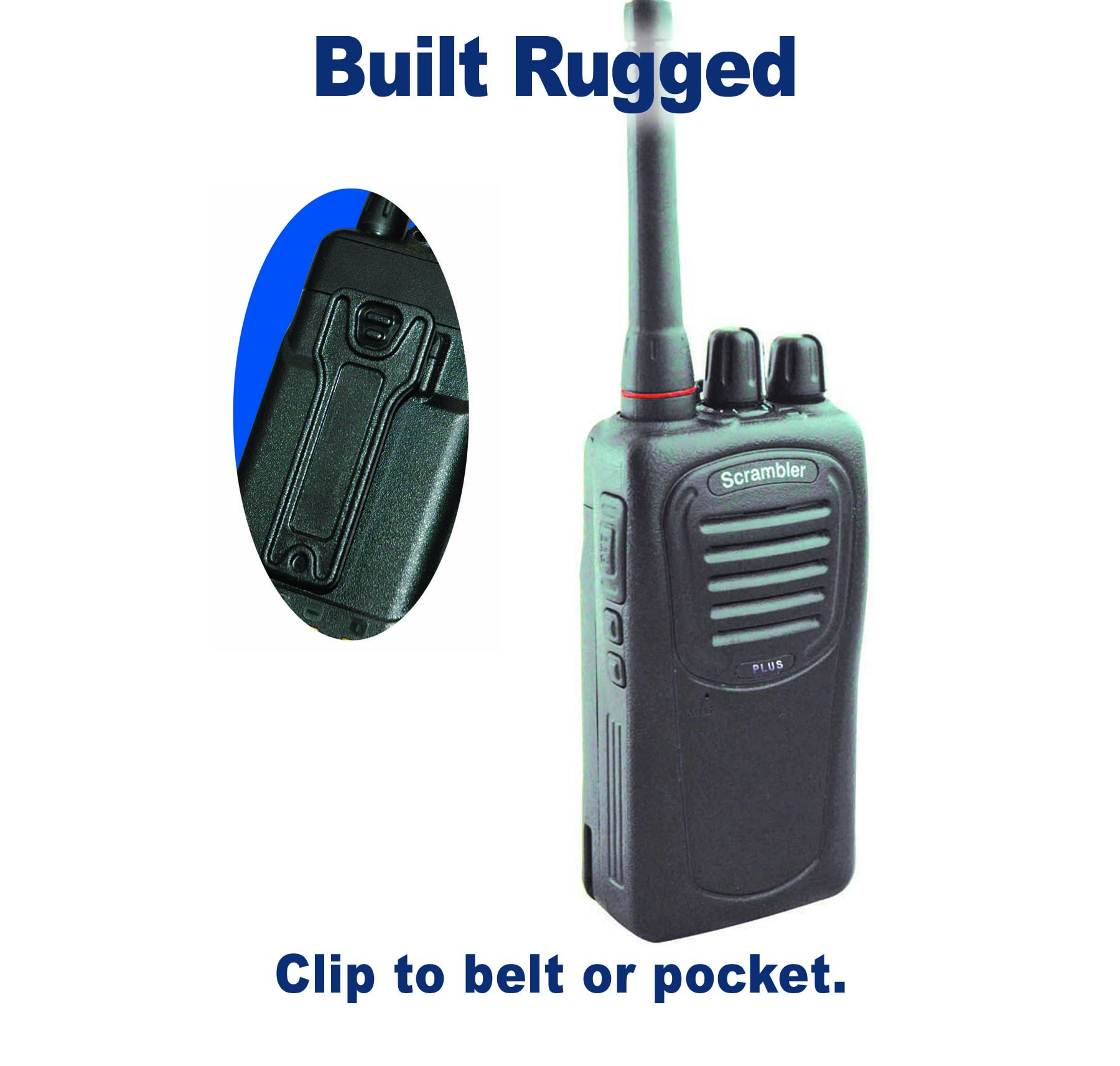 Scrambler PLUS two-way radios feature 500 Mw of punch out transmitting power that can penetrate concrete or steel with a range of up to 1 mile. Operating in the non-licensed FRS band with 14 frequencies installed.