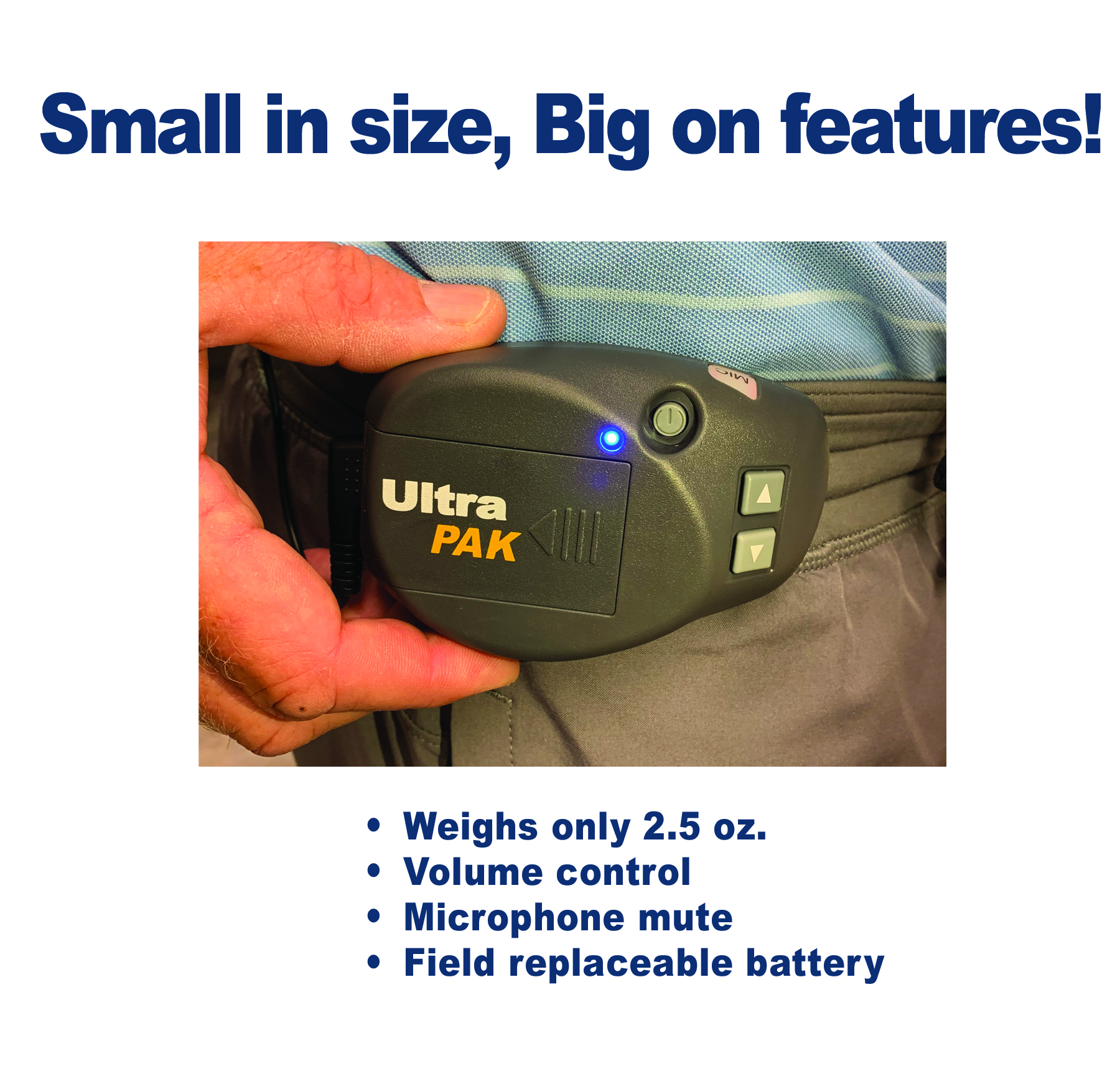 The featherweight Cyber and lightweight Monarch are the most popular headset models for the UltraPAK because they feature a discreet back-band design that provide a comfortable unisex fit.