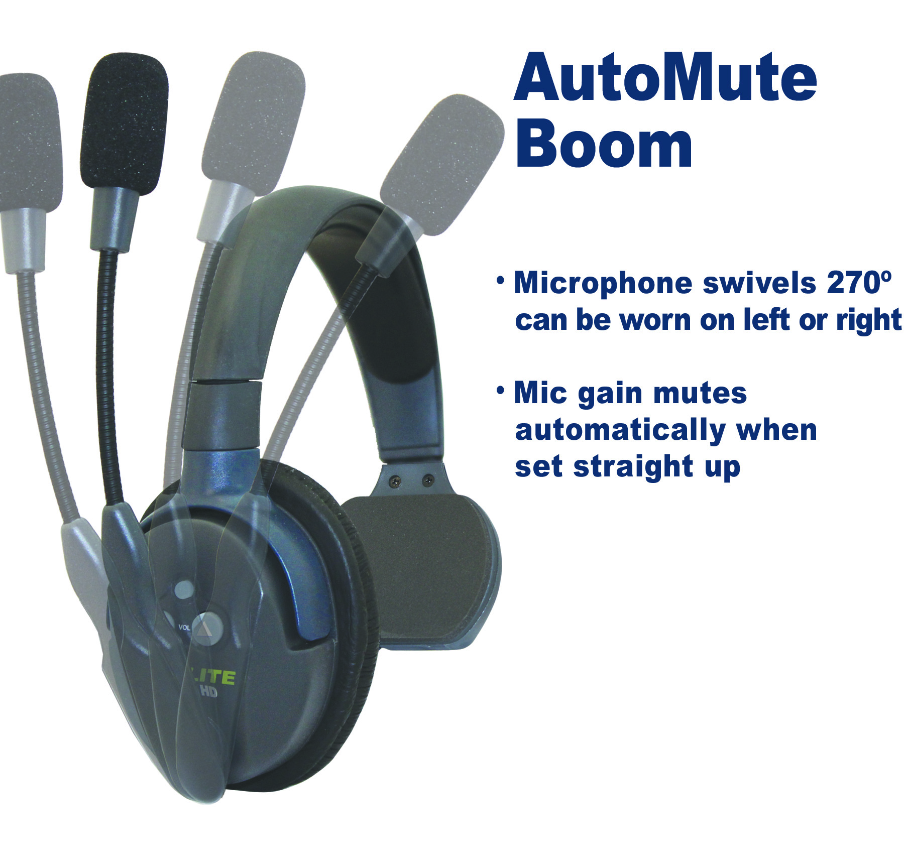 All UltraLITE headsets include EARTEC’s Auto Mute Mic boom technology. These specialty microphone assemblies feature an internal switch that automatically mutes the headset mic gain when set to the UP position. Using AutoMUTE is a simple and efficient way to mute your microphone signal.
